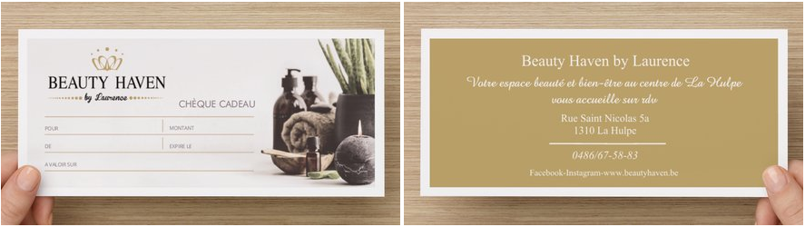 - Versez le montant que vous désirez offrir sur le compte BE35 0688 9848 2937, au nom de Beauty Haven, avec comme communication : GiftCard - Nom du/de la bénéficiaire.